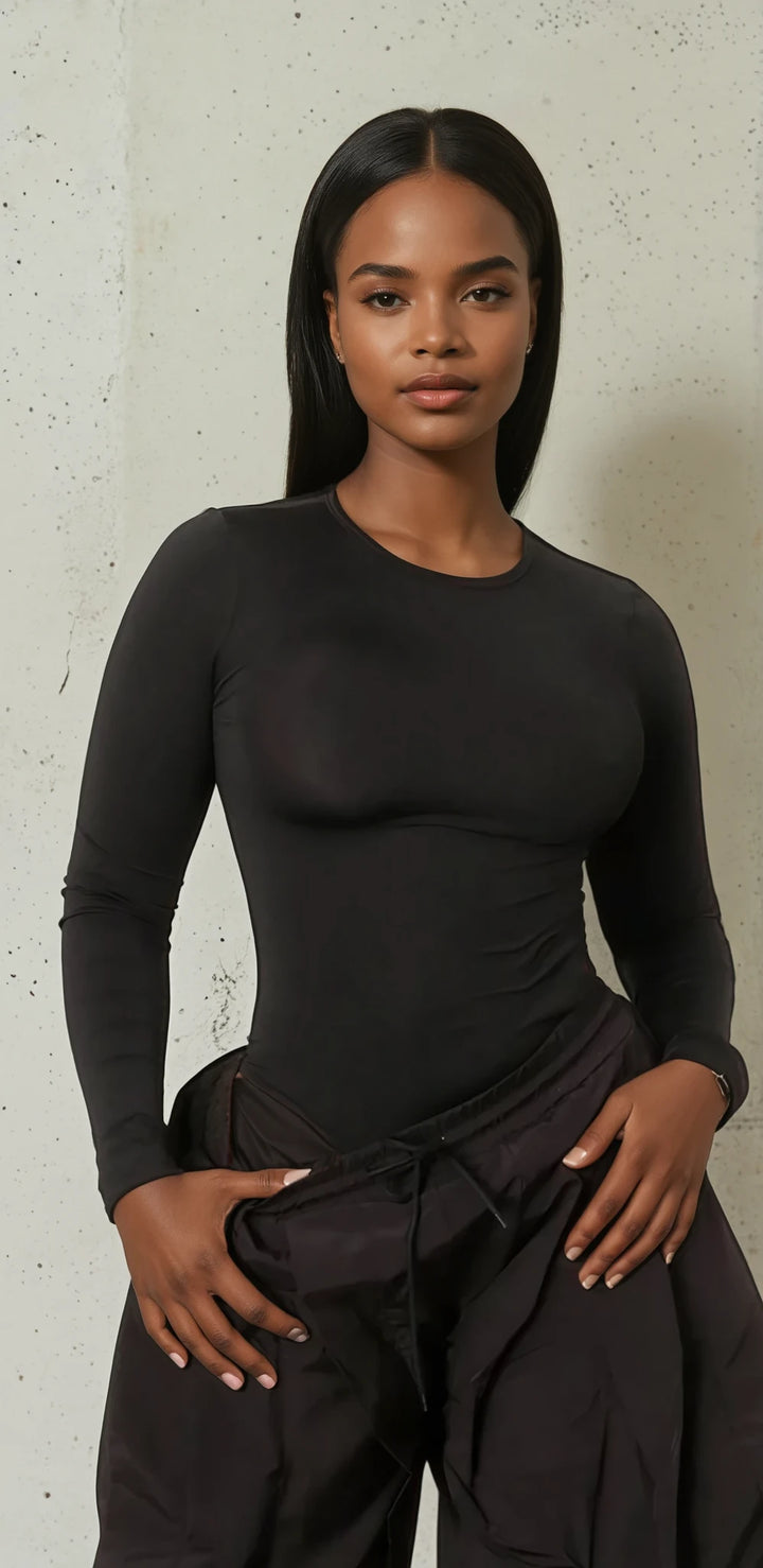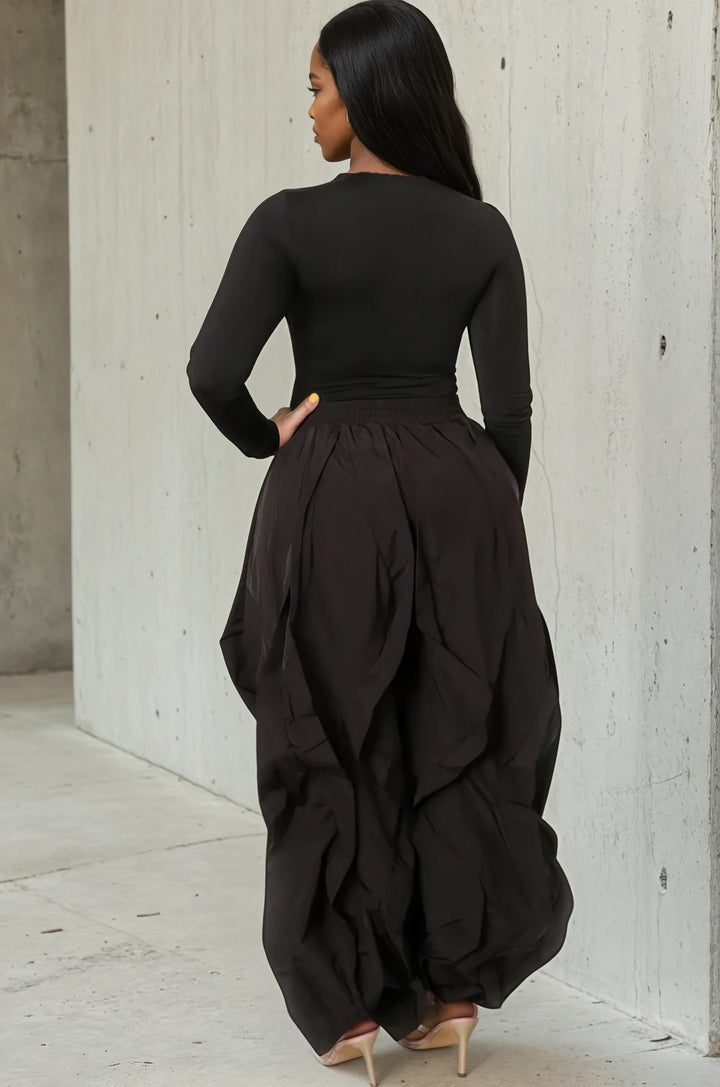 Black Bodysuit Top with Ruffle Trim Baggy Pants
