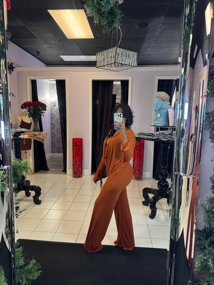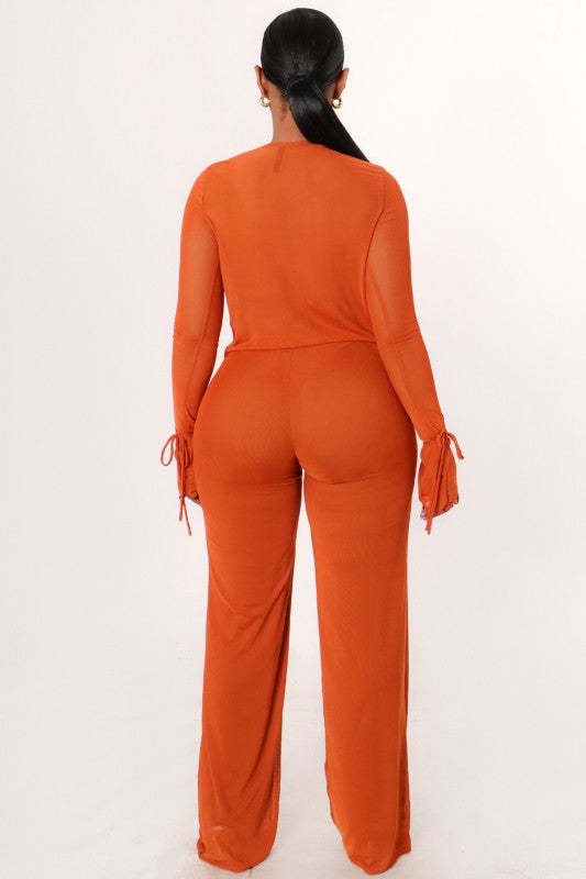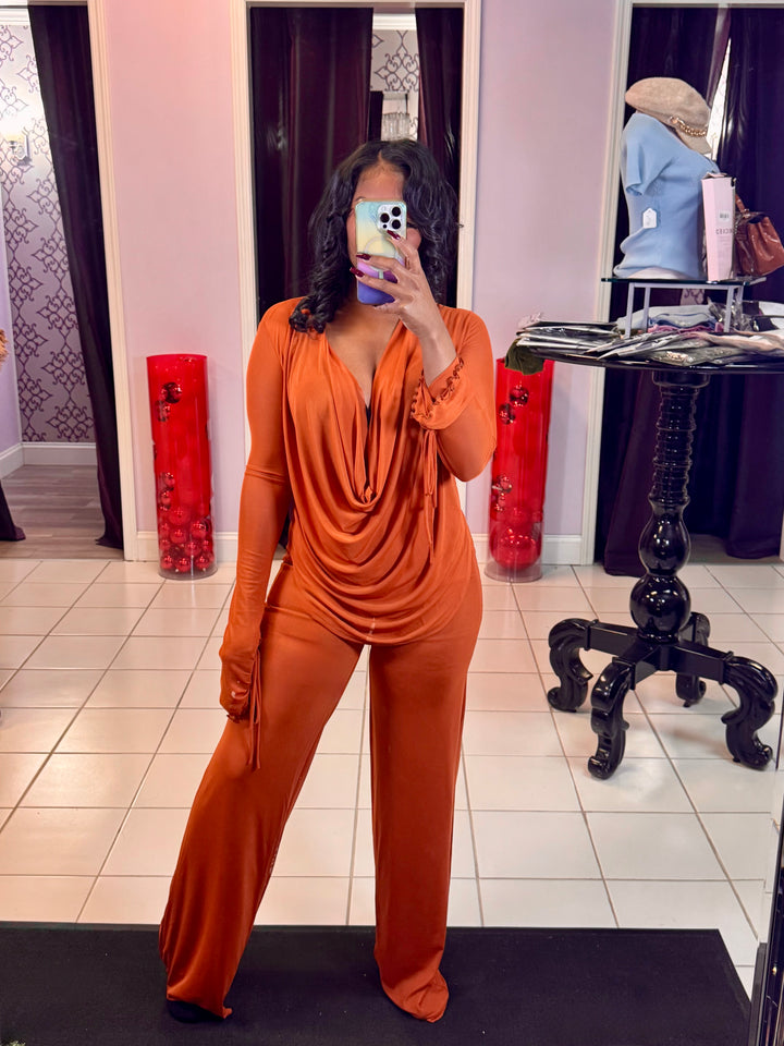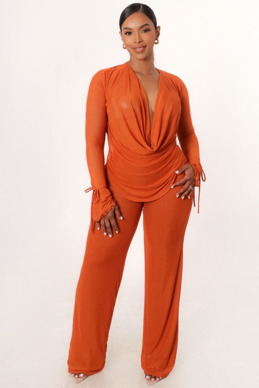 Rust Cowl Neck Mesh Top And Straight Leg Pant 2pc Set